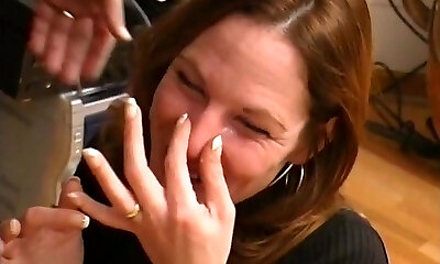 Beautiful gilr in stockings eats red-hot jizz after BJ
