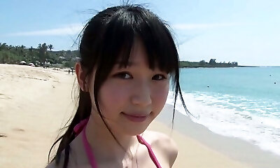 Slim Asian girl Tsukasa Arai walks on a sandy beach under the sun